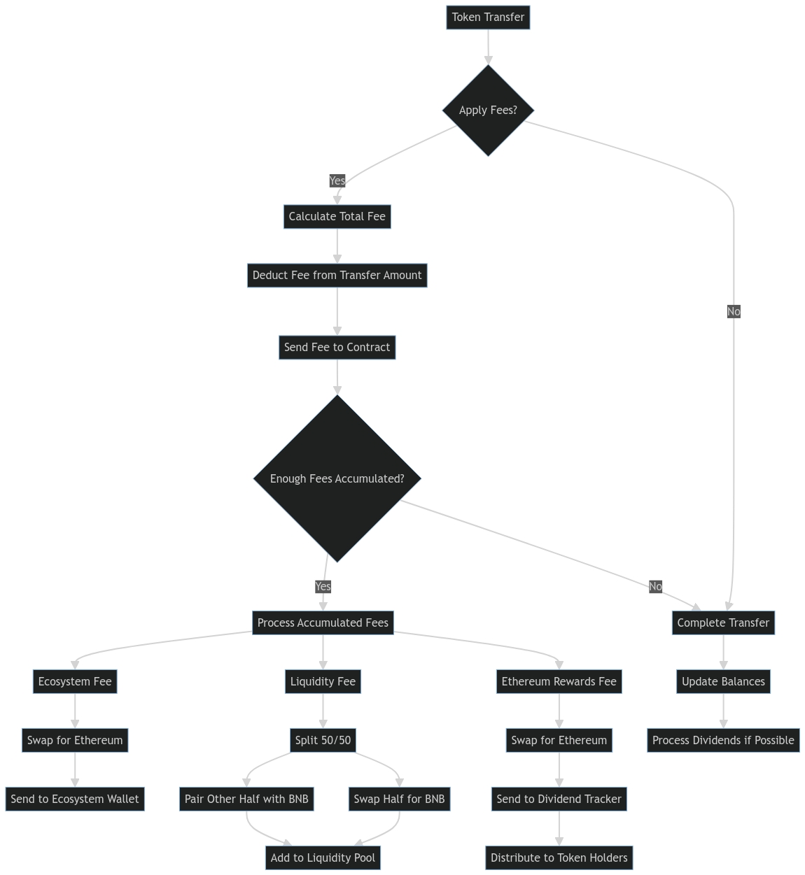 The EternETHReflect protocol implements a sophisticated tax mechanism on each token transfer. This mechanism is crucial for generating rewards, maintaining liquidity, and supporting ecosystem development. Here's a detailed breakdown of how it works: